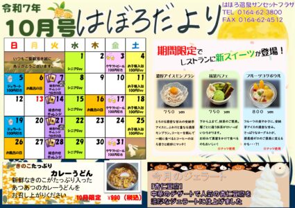 📢【はぼろだより10月号のお知らせ】 いつも羽幌温泉サンセットプラザをご利用いただき、誠にありがとうございます。10月も皆様に心からお楽しみいただけるイベントや新メニュ